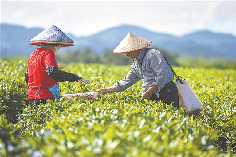 让“绿水青山”实实在在转化为“金山银山”。图为5月11日,海南省白沙黎族自治县茶农在忙着采摘茶叶。(图片来源:视觉中国)