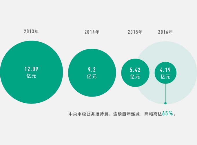 财政部公布的中央财政预算数据表明,2013年、2014年、2015年、2016年中央本级公务接待费分别为12.09亿元、9.2亿元、5.42亿元、4.19亿元,连续四年递减,降幅高达65%。