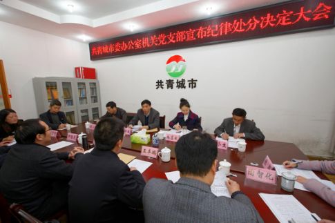 9时30分,省纪委相关负责人移步至另一个会场,这里要开展的,是共青城市委常委班子专题民主生活会。江西省纪委分管领导、省纪委案件审理室、负责承办黄斌案的省纪委第一纪检监察室和对口联系的第七纪检监察室以及九江市纪委主要负责人与会。省纪委有关室负责人宣布处分决定、通报相关案情,共青城市委常委班子成员采取一个一个过的方式,对照黄斌案的深刻教训,进行个人对照检查,听取批评意见。