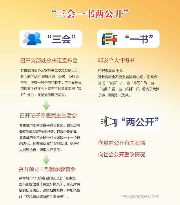 这是今年初江西省纪委发出的一份省管干部违纪通报。与以往不同的是,通报并没有一报了之,江西省纪委围绕这起违纪案件做起了“大文章”。3月3日,在黄斌曾经主政过的共青城市创新开展了“三会一书两公开”系列警示教育活动,包括召开支部处分决定宣布会、班子专题民主生活会、领导干部警示教育会,印发个人忏悔书,向党内公开有关案情、向社会公开整改情况。
