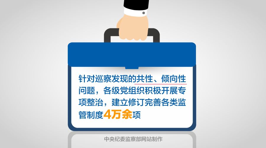 加强巡察成果运用既要抓好整改落实,也要完善制度、推进治本。针对巡察发现的共性、倾向性问题,各级党组织积极开展专项整治,建立修订完善各类监管制度4万余项,使工作不规范、制度不完善、执行不到位等问题及时得到整改,有效提升了基层党组织治理法治化、制度化、规范化水平。(中央纪委监察部网站 徐梦龙 | 制图 王婵)