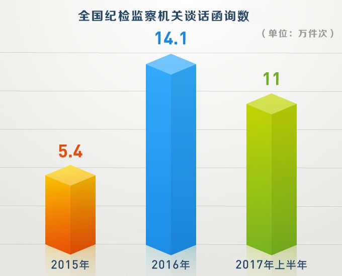 数据是最好的证明。2015年,全国纪检监察机关共谈话函询5.4万件(次);2016年,这个数字上升到14.1万件次;而2017年仅上半年,全国纪检监察机关就谈话函询11万件次,比去年同期增长162%。