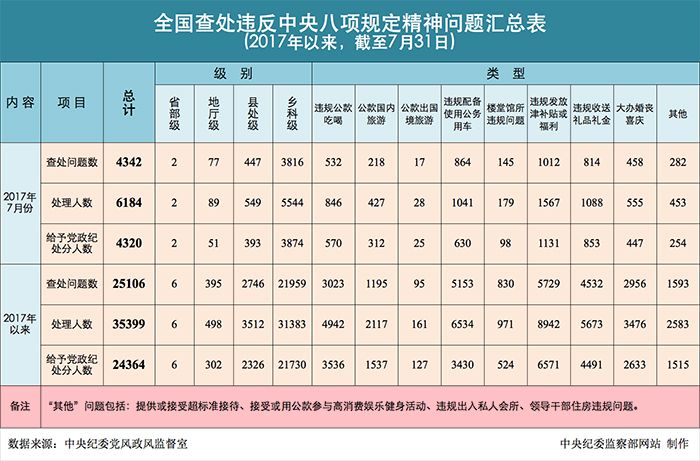 2017年7月全国查处违反 中央八项规定精神问题4342起