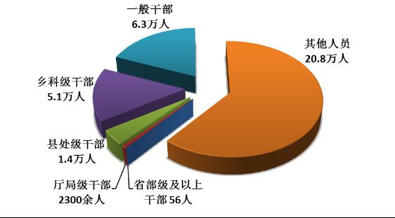 2017年1至9月,全国纪检监察机关共接受信访举报202.5万件次,处置问题线索83.3万件,谈话函询18.3万件次,立案38.3万件,处分33.8万人(其中党纪处分28.3万人)。处分省部级及以上干部56人,厅局级干部2300余人,县处级干部1.4万人,乡科级干部5.1万人,一般干部6.3万人,农村、企业等其他人员20.8万人。