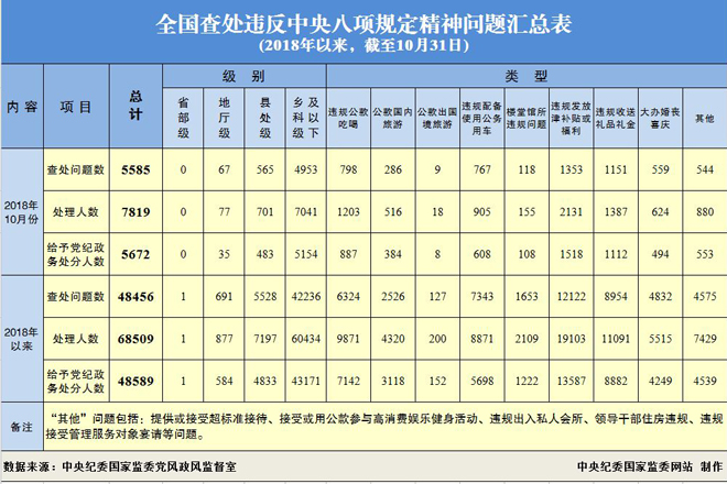 为掌握全国贯彻落实中央八项规定精神情况,中央纪委在各省区市和新疆生产建设兵团、各中央和国家机关、各中央企业和中央金融企业等建立了落实中央八项规定精神情况月报制度。2018年以来,截至10月31日,全国查处违反中央八项规定精神问题情况如下: