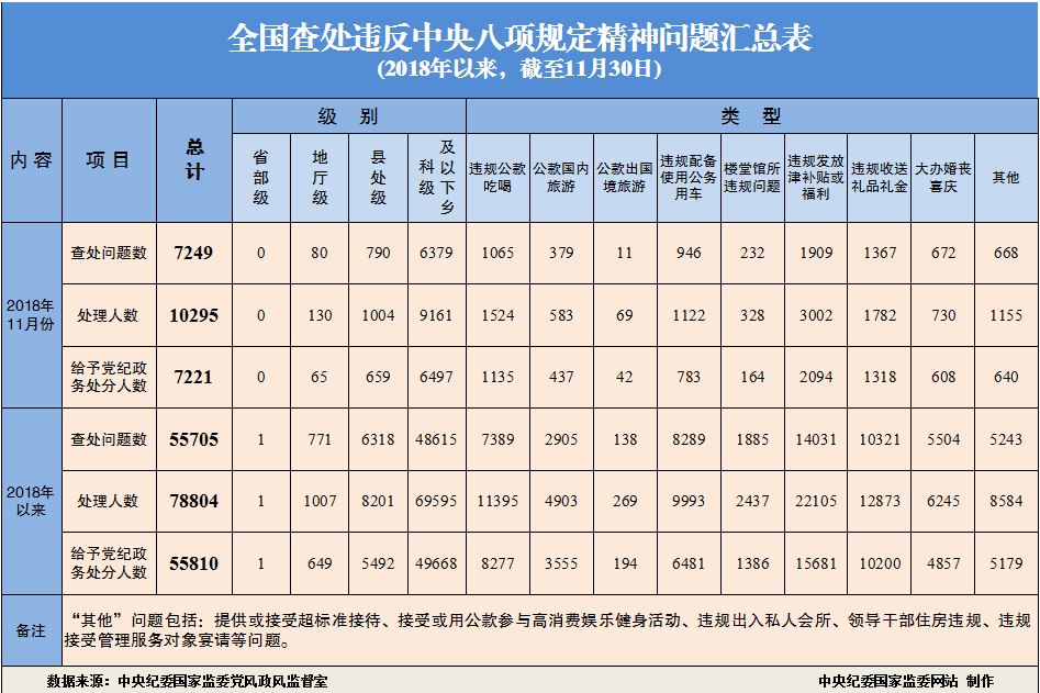 为掌握全国贯彻落实中央八项规定精神情况,中央纪委在各省区市和新疆生产建设兵团、各中央和国家机关、各中央企业和中央金融企业等建立了落实中央八项规定精神情况月报制度。2018年以来,截至11月30日,全国查处违反中央八项规定精神问题情况如下: