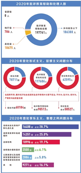 2020年初,中央纪委国家监委对数据统计指标作出调整,将查处形式主义、官僚主义问题数据纳入公布内容。1至12月,全国共查处形式主义、官僚主义问题78711起,批评教育帮助和处理117606人,其中党纪政务处分62595人,释放了进一步向形式主义、官僚主义突出问题亮剑的鲜明信号。
